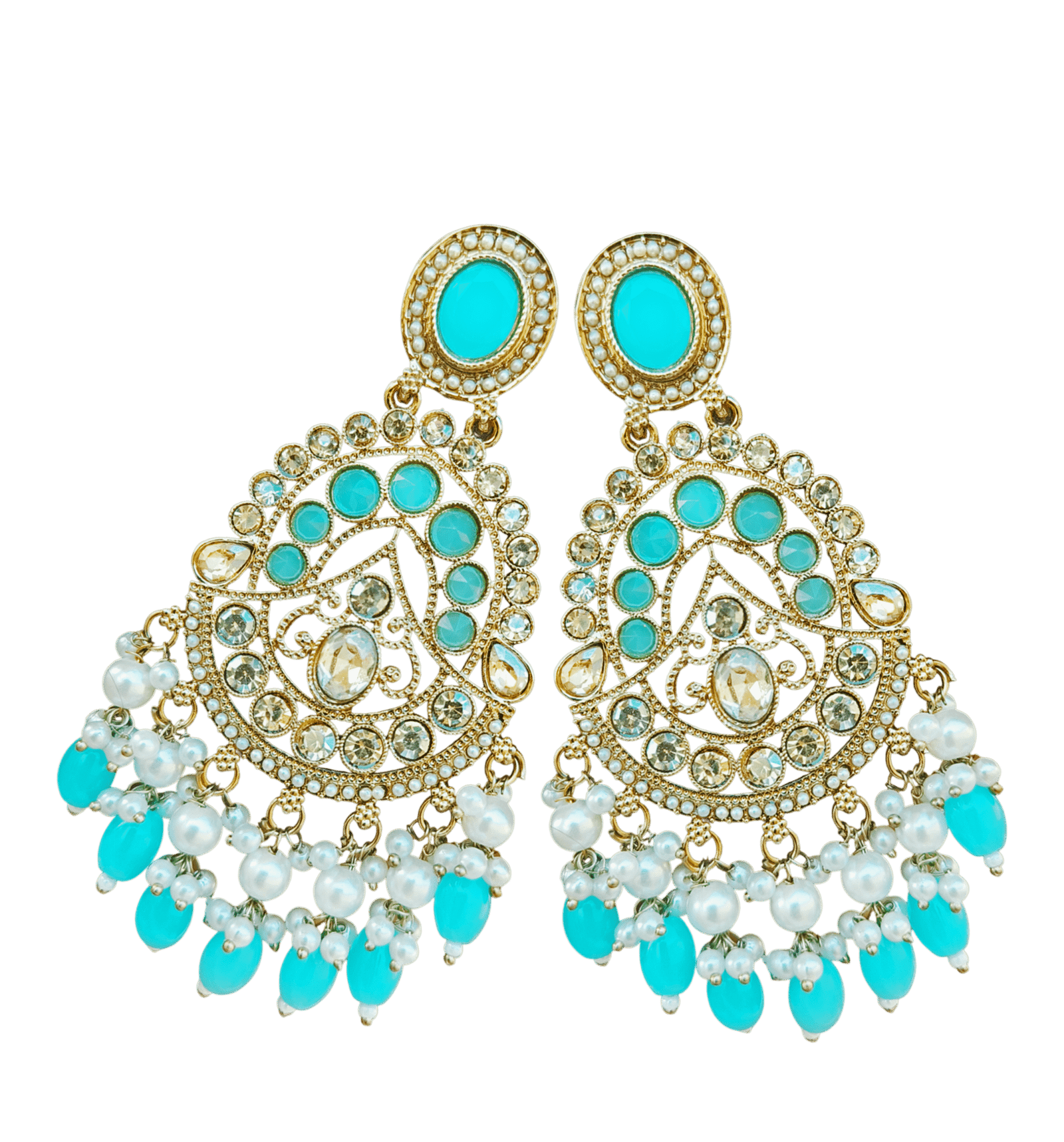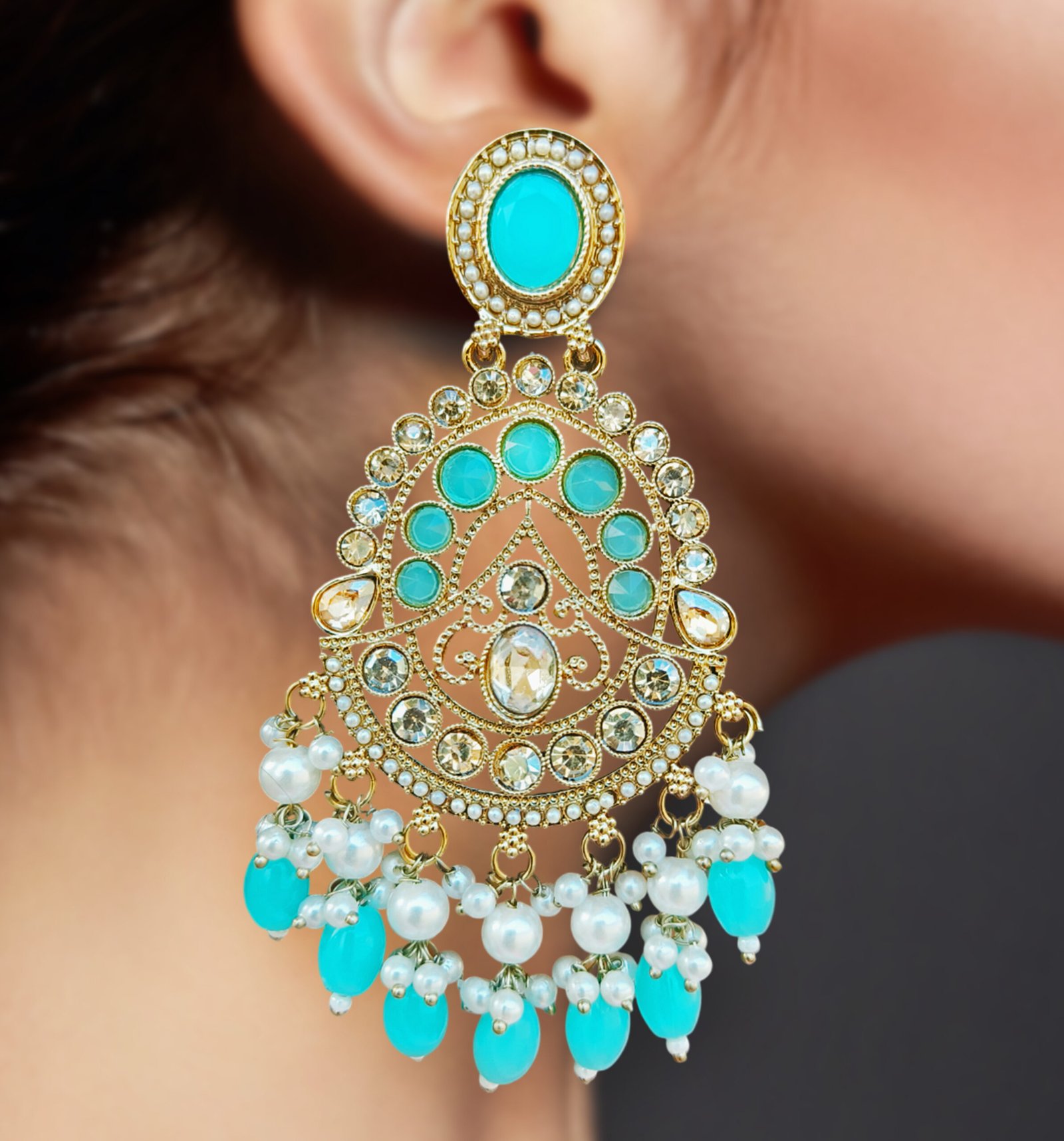Adorn yourself with royalty-inspired charm with this exquisite Cyan & Gold Maharani Earring from Sarvratna Jewellery. Intricately crafted with shimmering stones, kundan detailing, and elegant pearl and blue bead danglers, this earring captures the opulence of Indian tradition. The oval stud at the top leads into a beautifully designed pendant-style body, making it a must-have for grand occasions, weddings, and festive celebrations.