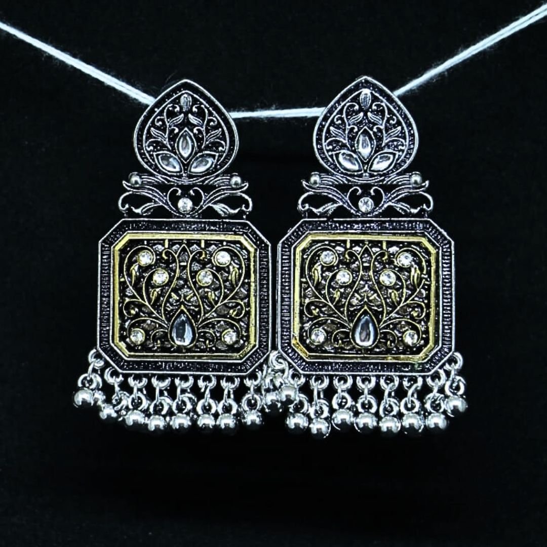 Discover timeless ethnic charm with these handcrafted oxidised earrings from Sarvratna Jewellery. Designed in a bold square silhouette, the center features intricate floral vine engravings highlighted in antique silver and gold tones. A lotus-inspired top adds a regal touch, while tiny metallic ghungroo danglers at the base bring rhythm and movement to the piece. These earrings are ideal for traditional functions, weddings, Navratri, and festive gatherings. Lightweight yet statement-worthy, they pair beautifully with sarees, kurtis, or Indo-western outfits.